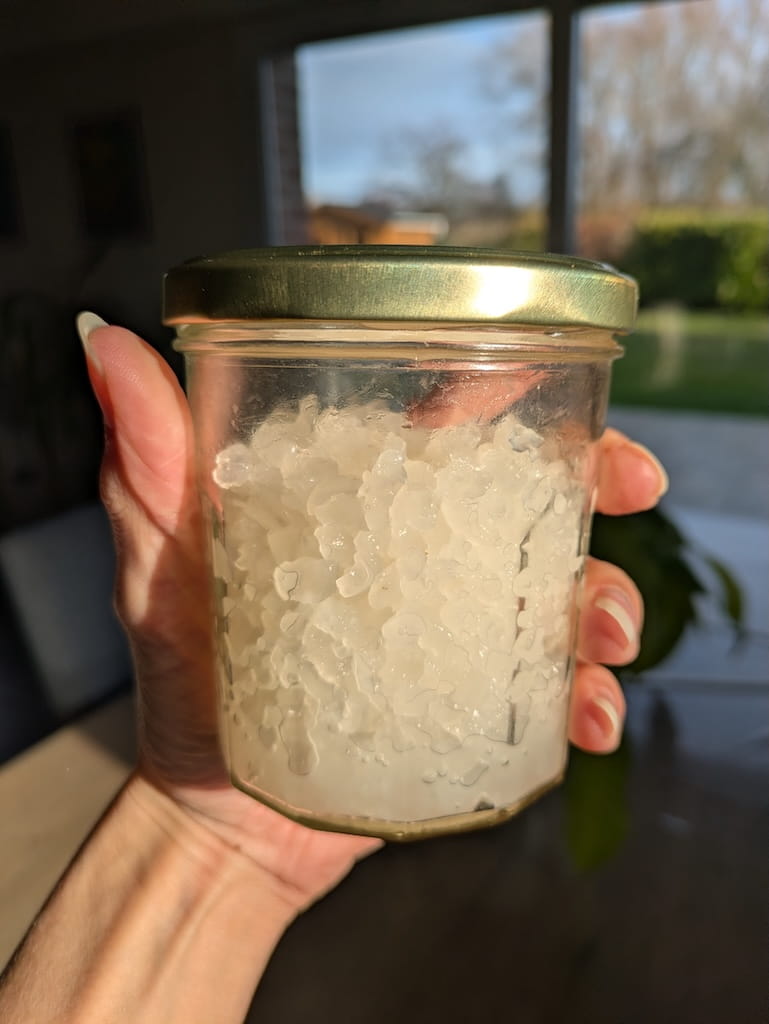 Les grains grandissent et se multiplient avec le temps, à condition de les nourrir régulièrement. Je les stocke dans un bocal au réfrigérateur, dans de l’eau sucrée que je change chaque semaine. Ils peuvent vivre indéfiniment si on en prend soin.